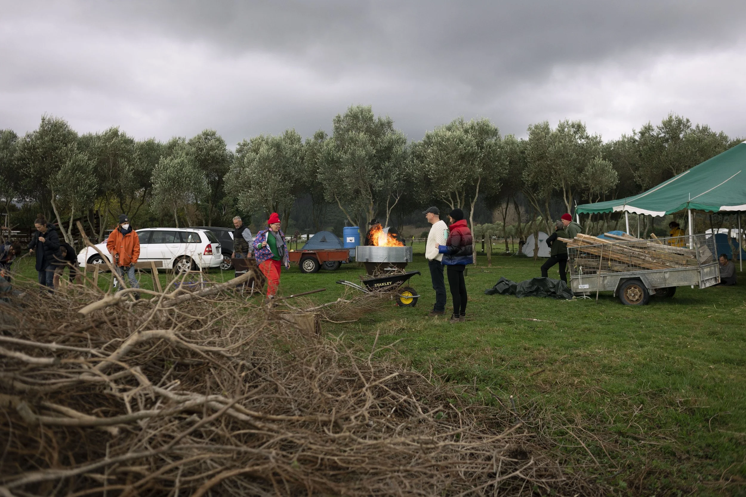 The collective nature of Te Waituhi ā Nuku-Drawing Ecologies, means that gathering together on the whenua at Kuku, and taking time to share kai and korero, is the most important and best part of the whole project! This hui saw us once again camping in the olive grove; hanging out, chatting, eating, snapping branches, chopping wood, and feeding the kiln over a four hour period. Under Phil’s expert tuition, we were building our confidence with biochar making. Using two, flame-cap kilns, we made a large amount of biochar, and made a big dent in the stock-piled firewood collected from the site; dead orchard trees and olive tree prunings. This biochar will be used on site for the next part of this carbon sequestering project.